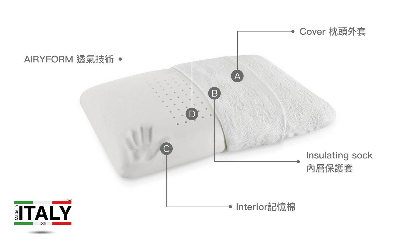 | Ⓓ | The pillow’s special design ensures perfect breathability and optimal dispersion of moisture and heat, due to the structure of the foam. |