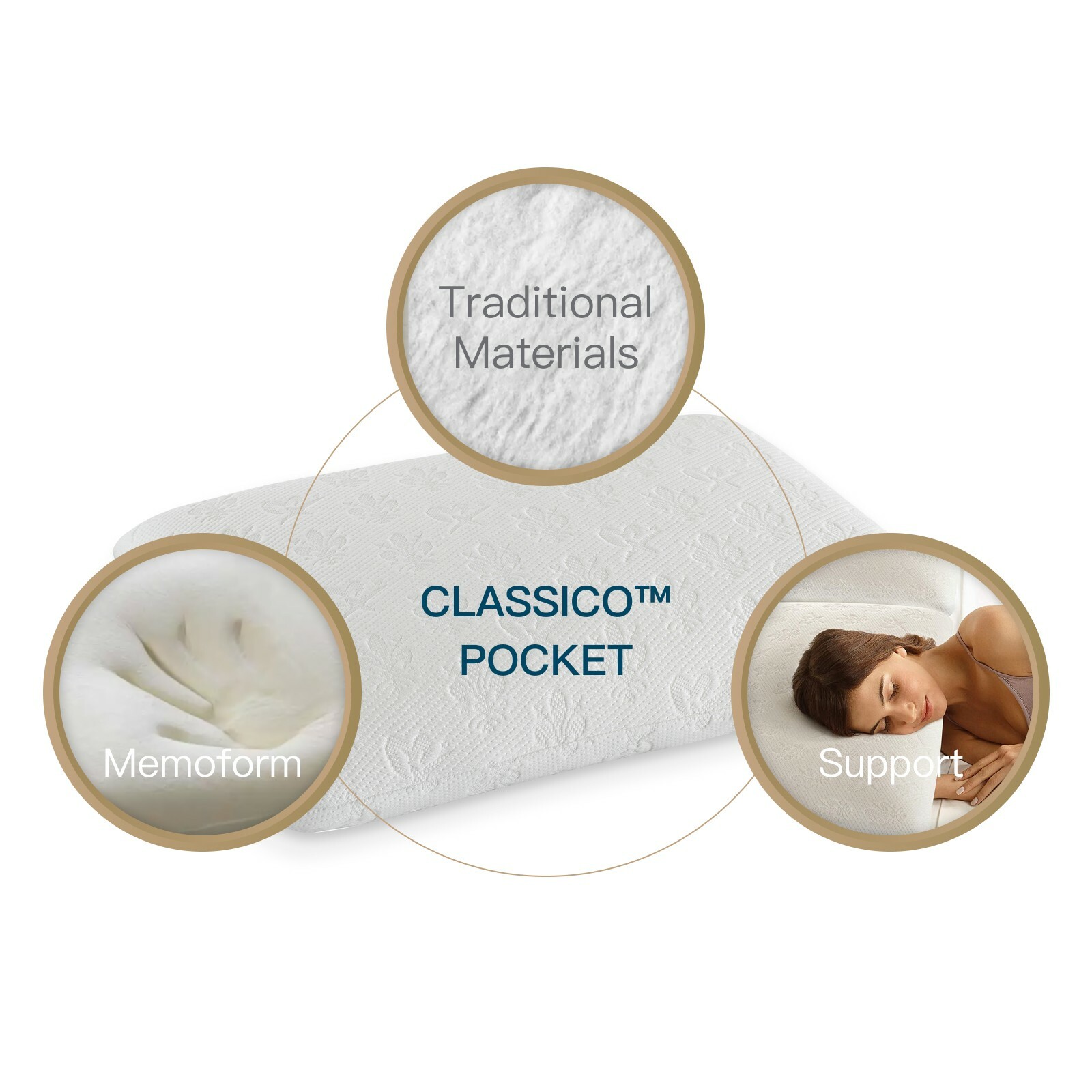 Classico Pocket is the perfect combination of all the features of the Classico line in a compact format for a maximum practicality. The layer in Memoform provides differentiated support to the head, neck and shoulders and a sensation of matchless comfort while you sleep.