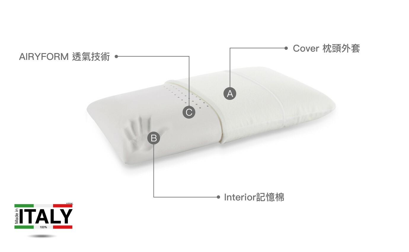 Guaranteed breathability The special structure in airyform, which is highly breathable thanks to the continuous airflow inside the pillow, guarantees a high level of freshness and breathability.
