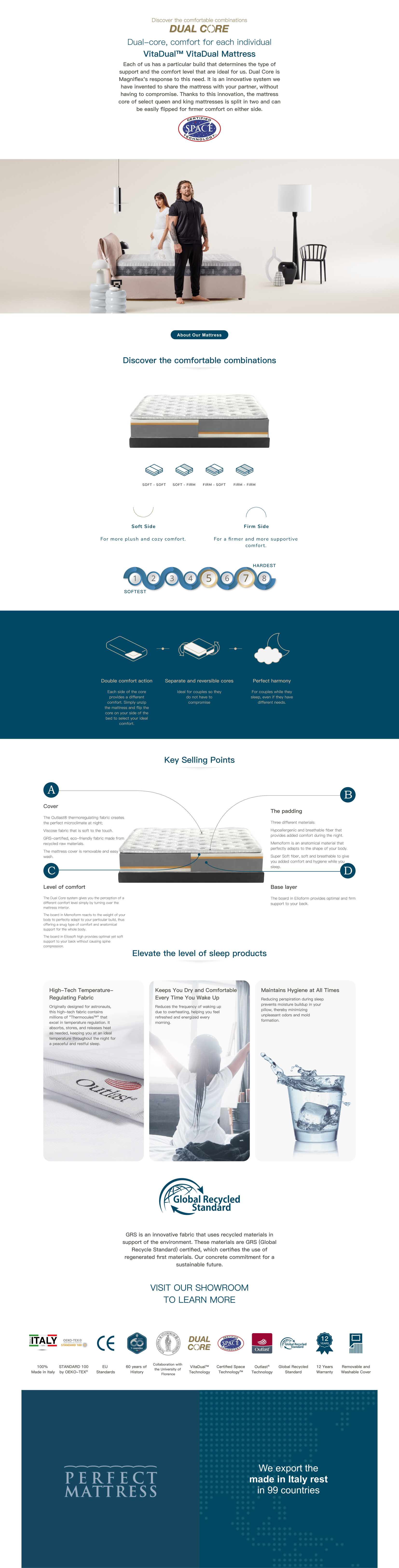 Customize your comfort with Memoform and Eliosoft layers. Remove the cover to choose your setup. Memoform reduces pressure points and boosts circulation. The soft viscose and Outlast® cover regulates temperature and has GRS certification. Experience medium-soft to medium-firm comfort.