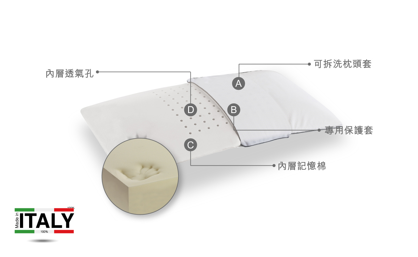 The pillow’s special design ensures perfect breathability and optimal dispersion of moisture and heat, due to the structure of the foam. |