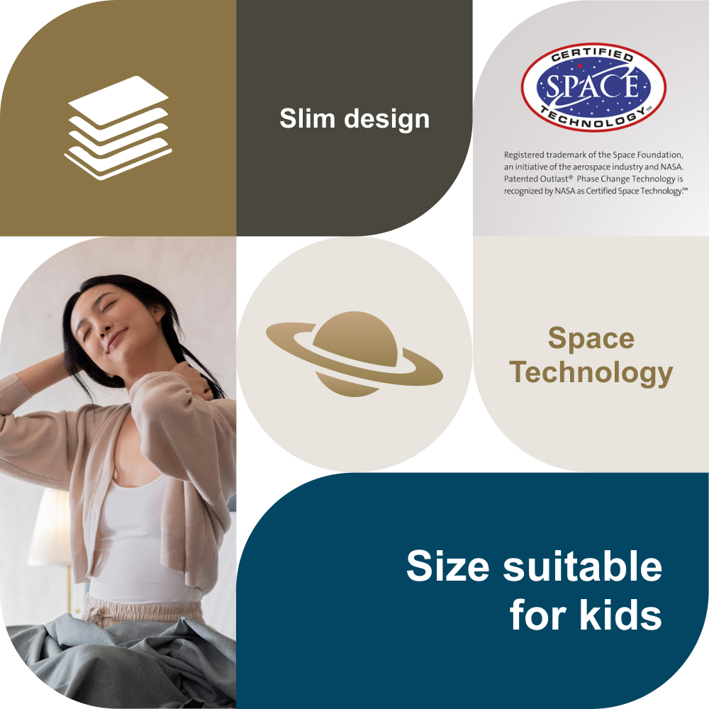 | Perfect microclimate High tech fabric, designed for astronauts’ spacesuits. The fabric contains millions of small spheres which absorb excess heat and release it when body temperature falls during the night. It therefore maintains an ideal temperature for a good night’s rest.