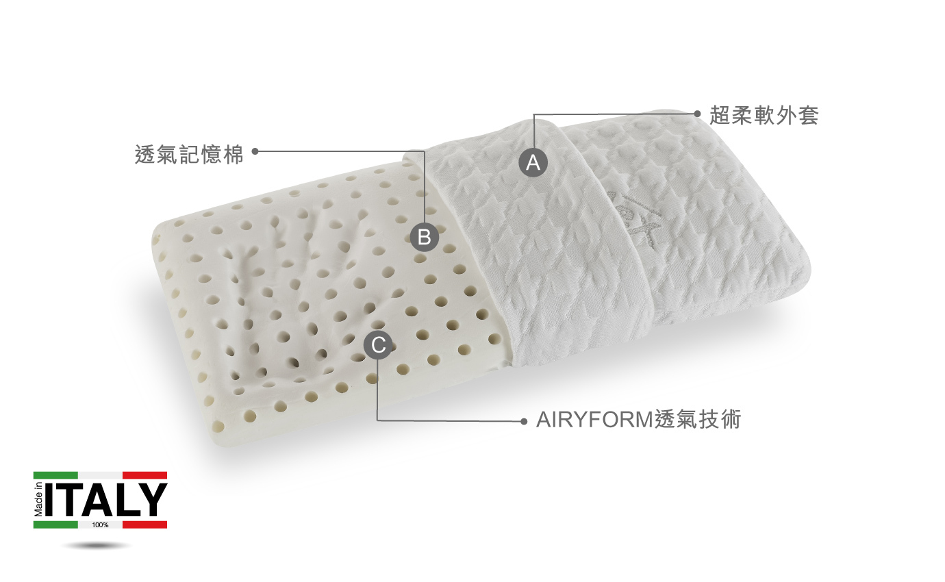| AIRYFORM透氣技術 BB枕頭內部的特殊開孔設計可以調節溫濕度,確保嬰兒在使用期間透氣乾爽。BB枕頭內部的空氣循環,令產品內外均保持適當溫度,讓寶寶睡眠加倍舒適。 透氣記憶棉 - 高度透氣 專家特別設計,加強持續通風,保持乾爽。