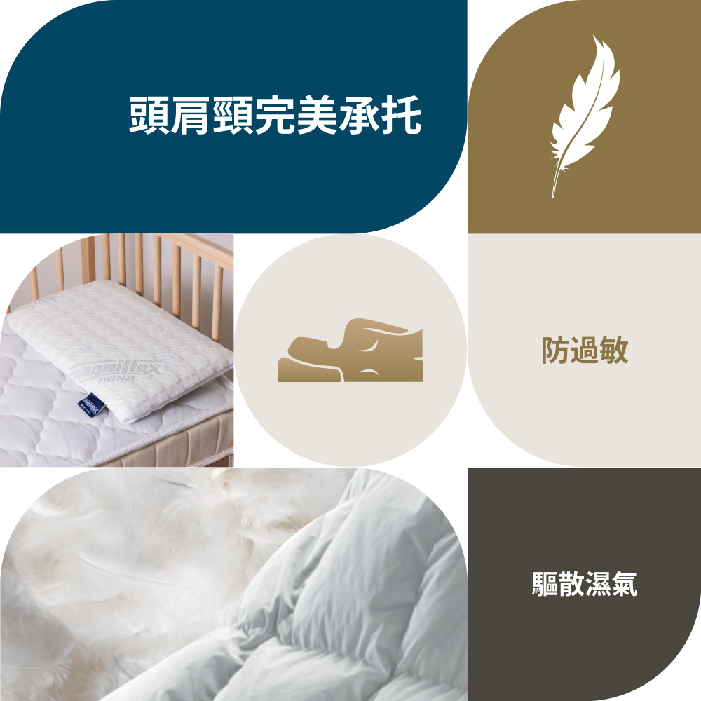 MagniProtect™ Baby Star Pillow 抗菌防過敏嬰兒枕頭,由60年悠久歷史的Magniflex專業團隊與佛羅倫斯大學共同研製,榮獲多項國際認證,包括OEKO-TEX® Standard 100最高標準,保證不含任何對嬰兒有害或致敏物質。Magniflex多年生產床上用品的豐富經驗,融合對細節的注重,設計出這款BB枕頭,旨在為您的孩子於睡眠時演奏一首完美的催眠曲。