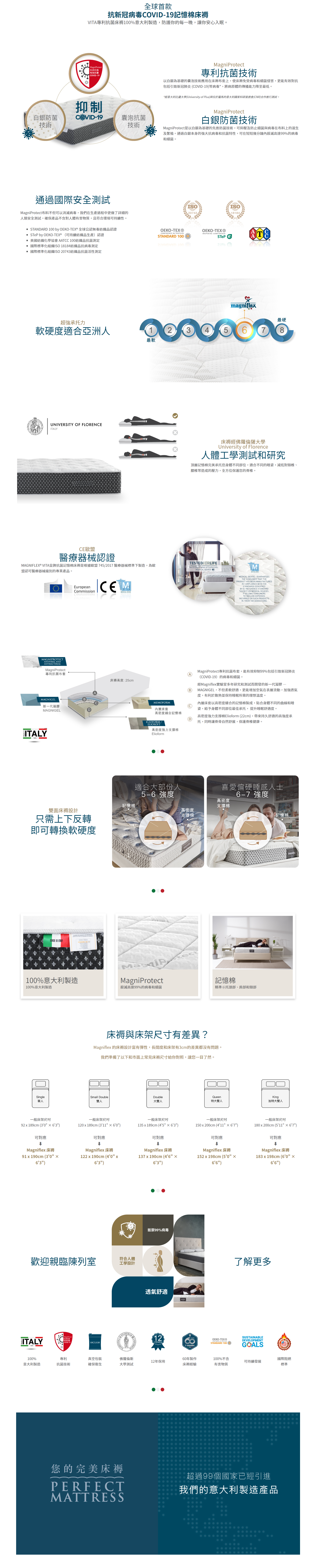 VITA 採用Magniflex開發的創新MagniProtect™專利技術,為全球第一款抗菌抗病毒記憶綿床褥,有效抵禦99%包括引致新冠肺炎(COVID-19)的病毒和細菌,防護你的每一晚,讓你安心入眠。