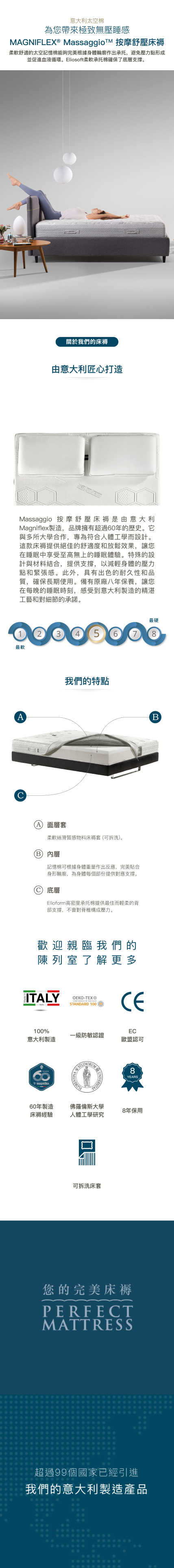 柔軟舒適的太空記憶棉能夠完美根據身體輪廓作出承托,避免壓力點形成並促進血液循環。Eliosoft 柔軟承托棉確保了底層支撐。