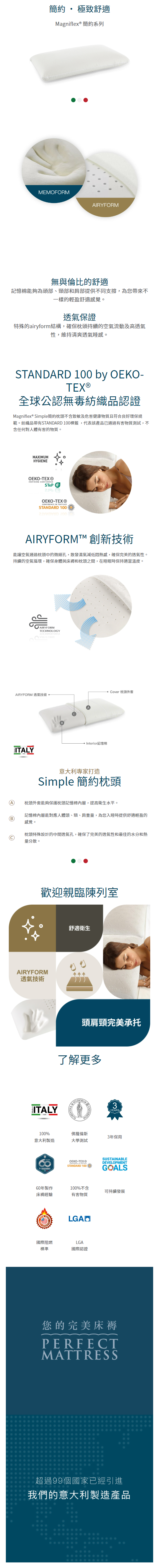 產品是結合Magniflex所有基本品質的精緻體現。100%意大利製造,透氣的記憶棉內部有助空氣隨著身體不同的擺動而流動,並有效支撐頸部和肩部,帶來真正非凡的放鬆體驗。