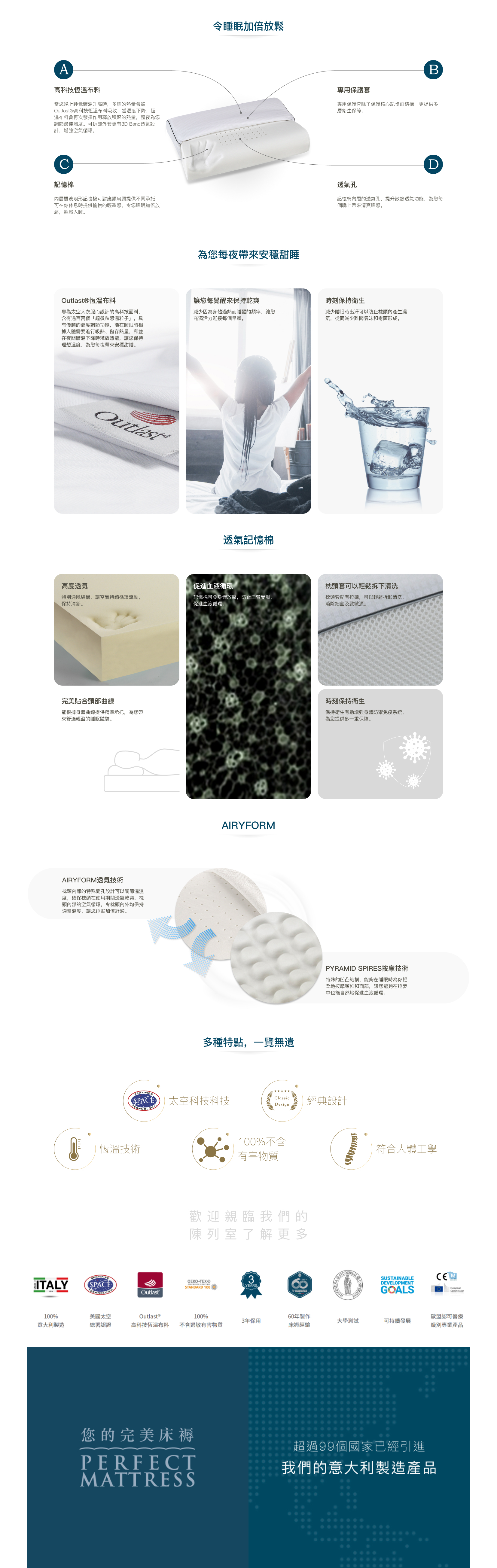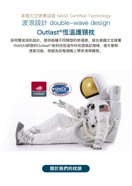 Outlast®恆溫護頸枕採用雙波浪形設計,提供兩種不同類型的舒適感。結合美國太空總署(NASA)研發的Outlast®高科技恆溫布料和透氣記憶棉,提升散熱透氣功能,保證為您每個晚上帶來清爽睡感。